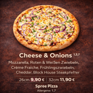 Die Pizza Cheese & Onions von Spree Pizza ist eine besondere Spezialität für alle, die cremige Käsesorten und würzige Zwiebeln lieben. Diese Pizza verbindet intensive Aromen mit einer angenehm cremigen Textur und sorgt für ein einzigartiges Geschmackserlebnis.