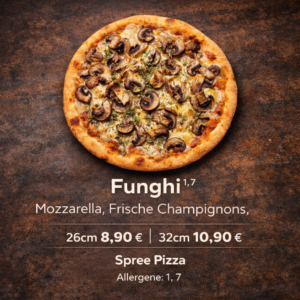 Bestelle deine Pizza Funghi online bei Spree Pizza und genieße schnelle Lieferung oder bequeme Abholung in Berlin 12557. Frisch gebacken, heiß serviert und voller Geschmack – direkt zu dir nach Hause.