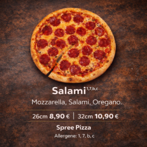 Bestelle deine Pizza Salami online bei Spree Pizza und genieße schnelle Lieferung oder bequeme Abholung in Berlin 12557. Frisch gebacken, heiß geliefert und voller Geschmack – direkt zu dir nach Hause.